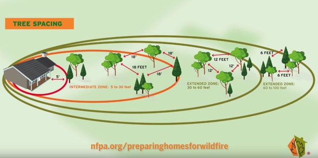 NFPA. Specific actions are made available to homeowners and businesses for the reduction of wildfire risk. The primary strategy is creating defensible space using the Ignition Zones principle. Based on USDA Forest Service research, this principle establishes zones at 5ft., 30ft., and 100ft. distances from the primary structure. It also recommends spacing of trees at 18ft., 12ft., and 6ft. increments according to the Ignition Zones (see Tree Spacing image).